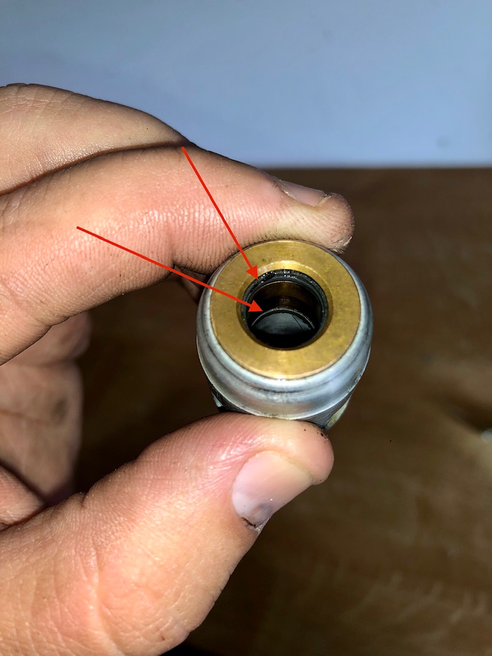 On retire délicatement les deux bagues composites+leurs joints OR cachés derrière , il y en a deux; à retirer de préférence avec un outil plastique pour ne pas rayer les portées de joints