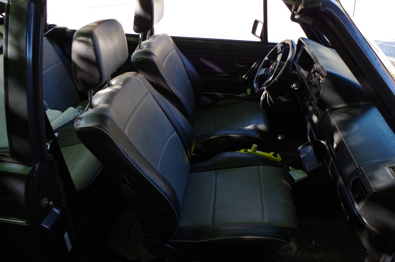 GOLF 1 cabriolet de 1990 bleu LA5y capote beige intérieur simili bi ton bleu (housses de très bonne qualité rajoutées il y a très longtemps), un petit volant cuir base plate qui n’est vraiment pas d’origine mais me plait beaucoup, 4 feux et 2 antibrouillards (déjà sur la voiture à l’achat). Antibrouillards qui ont failli mettre le feu à la voiture car montés en direct sans relai !!!