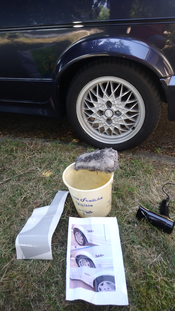 J'ai découpé la partie haute qui dépasse (je ne démonte pas le kit karmann pour le coller dessous), j'ai suivi la même courbure que côté roue.