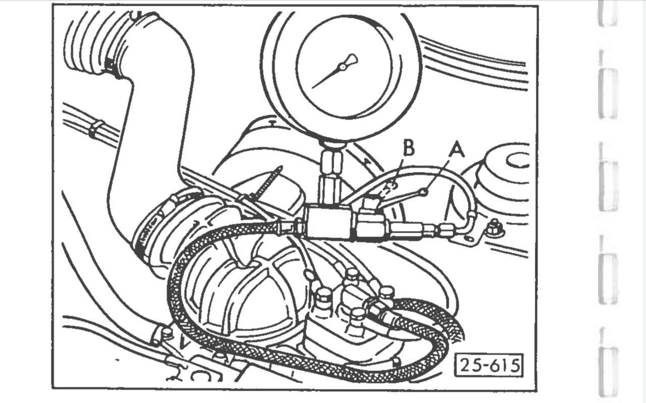 5 bars tout le temps, la pompe fournit vers les 6,5 bars, d'où le régulateur (la vis avec les rondelles) qui relanche en continue l'essence vers le réservoir.