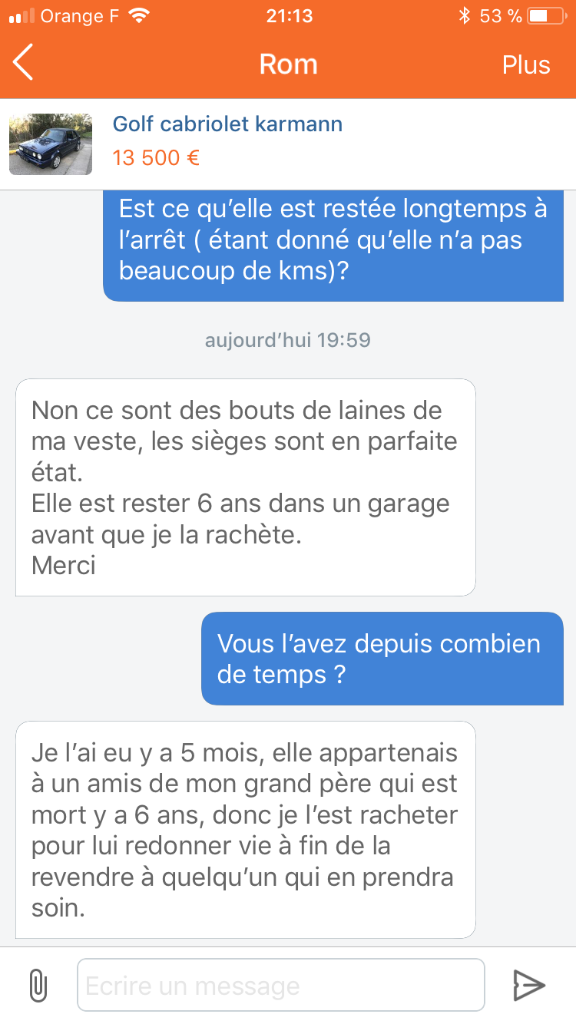 je préfère une voiture qui viens d'un passionné et qui l'as de puis plusieurs année plutôt qu'une personne qui fait une remise en route et ne connais pas la voiture