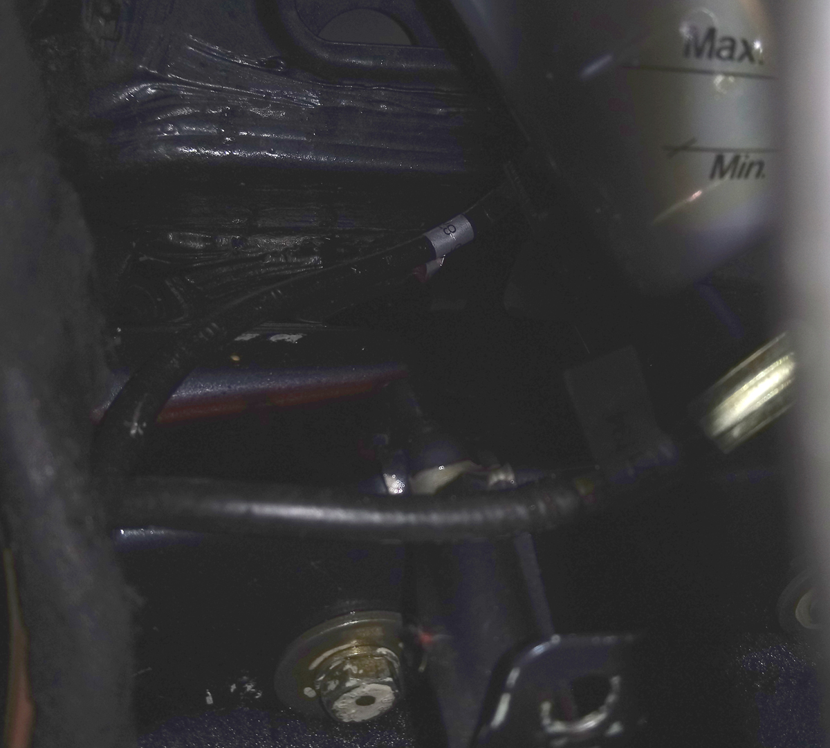 J'ai regardé à droite derrière le cache et j'ai un filet de gras, pas frais d'aujourd'hui. Je pense que j'ai une petite fuite à droite qui en même temps me tache la capote (d'ou l'auréole)