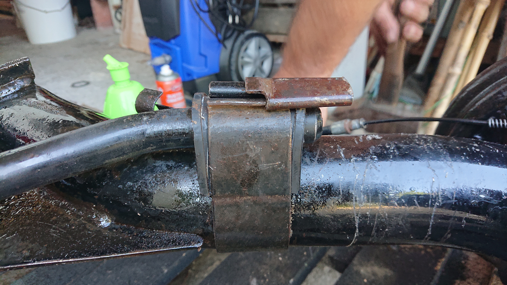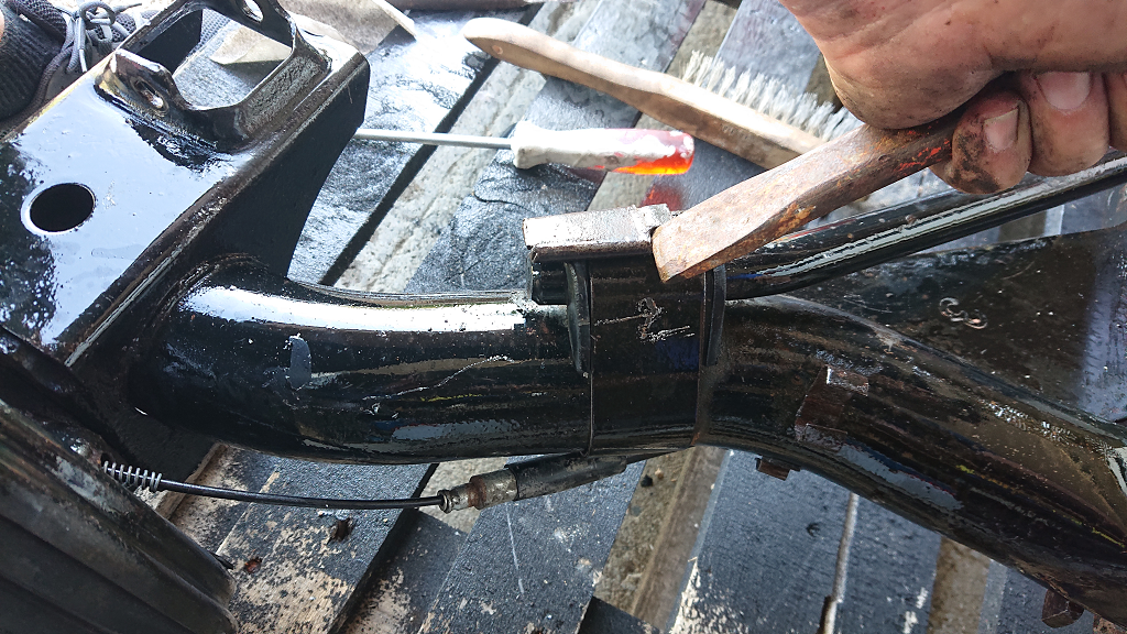 On peut désormais procéder à l'extraction de l'agrafe avec marteau et burin, en alternant d'un coté et de l'autre de l'ergot afin de progresser de manière uniforme de chaque coté du collier. Dans mon cas, c'était légèrement grippé, donc un coté du collier avançait avec l'agrafe : un retour arrière , un coup de dégrippant et maintenir le collier en même temps que l'on extrait l'agrafe (à 2 c'est mieux!) , une fois dégrippé ça sort bien