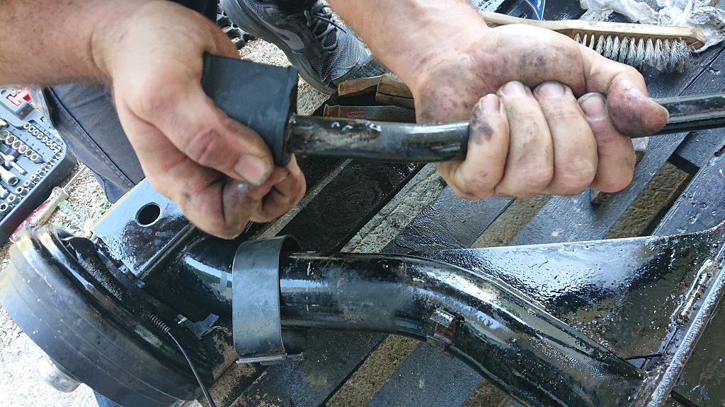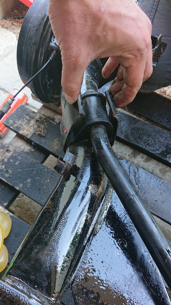 On remet le collier en place autour du silent bloc et on le serre en le pinçant avec les doigts afin de pouvoir l’attraper a la tenaille :