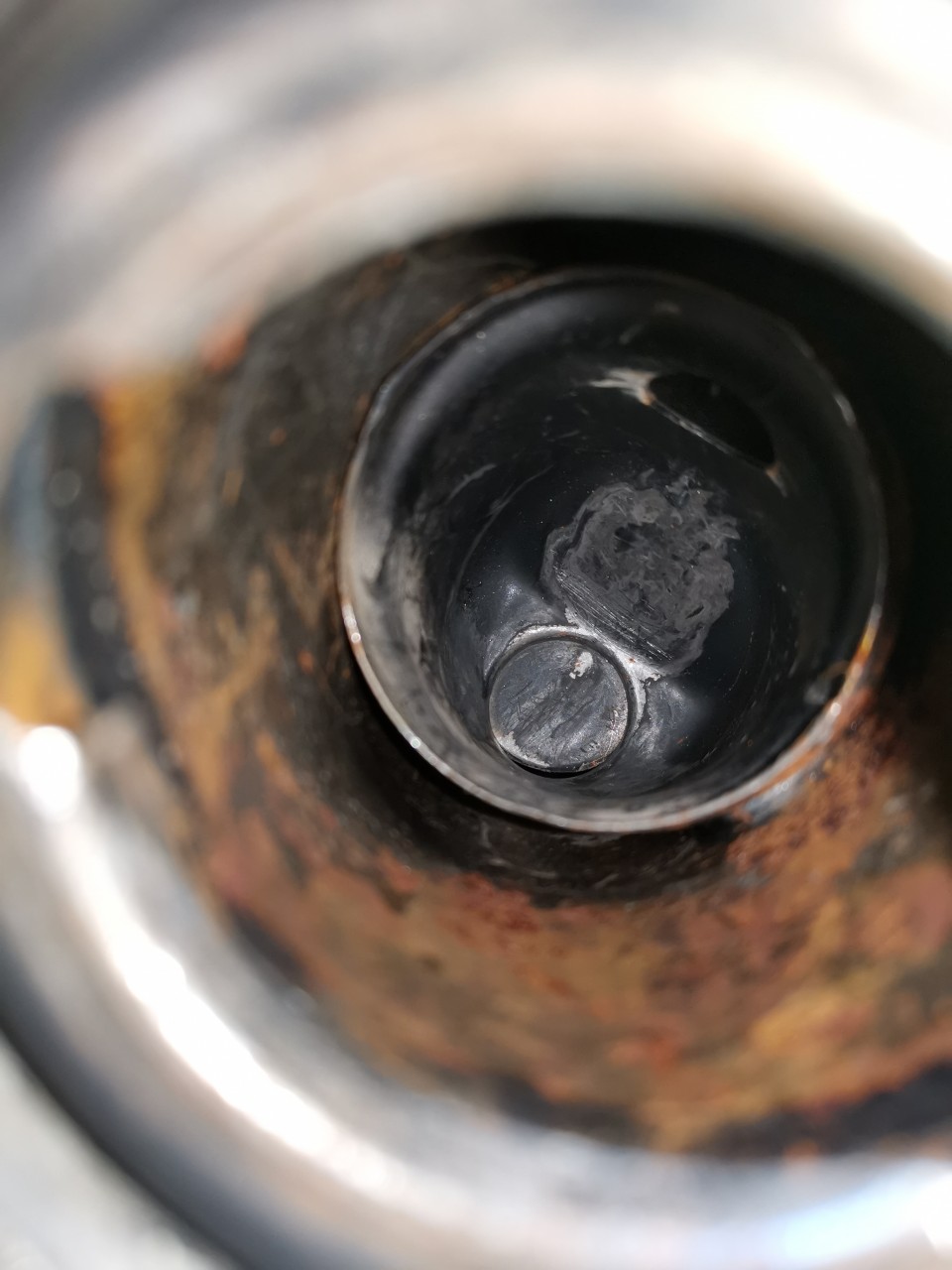 Tu peux très bien avoir un morceau de bouchon du réservoir coincé dans la goulotte lors d'une perte de clé, qui aurait occasionné la destruction du bouchon
