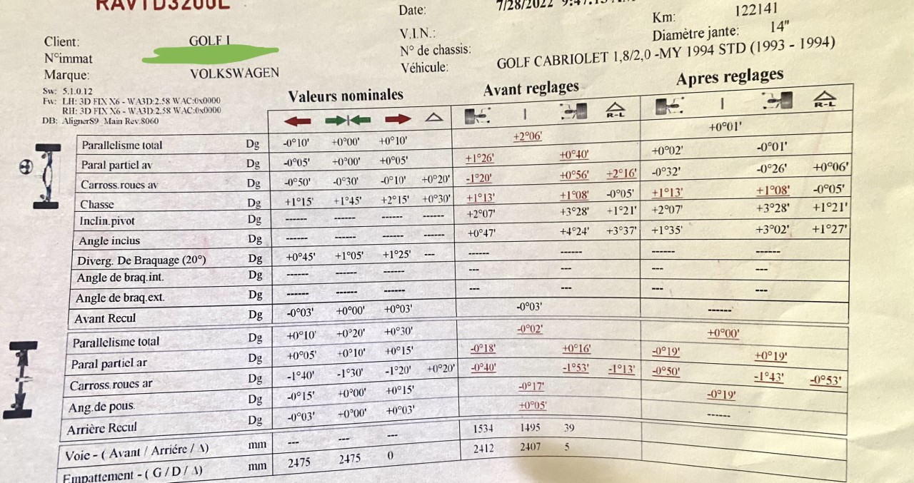 Qui dit changer des rotules dit faire la géométrie des trains. Je paye donc une géométrie pour enlever ce satanée ripage qui me rend la conduite fatiguante et use mes pneus.