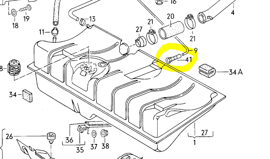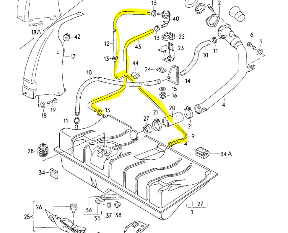 Je suis en train de changer le réservoir d'une golf 1 cabriolet de 1981, hors celui-ci n'était pas en place avant donc je ne vois pas bien comment remonter les durites et surtout celle entoure en jaune sur le schéma, car je n'ai pas cette sorti sur le mien.