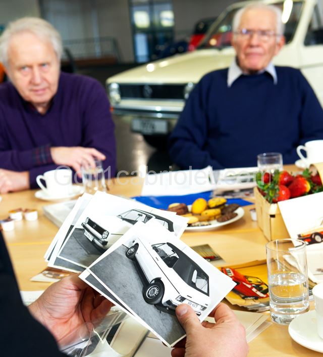 “Osnabrück. Fünf Stühle und zwei Tische zwischen 73 Autos. Auf den Stühlen fünf Zeitzeugen, auf dem Tisch ein Erdbeerkörbchen voller saftig-roter Früchte. Mmhh, verlockend. Genau so, wie die in der Automobilsammlung Volkswagen Osnabrück versammelten Schätze: Designstudien, Prototypen, Meilensteine allesamt. Die fünf Herren der Runde haben sie alle zwischen ihren Fingern gehabt oder gar mit ihren grauen Zellen erfunden. Heute erinnern sie sich an 35 Jahre Golf Cabriolet. Am Anfang ging es um die Zukunft. Um die der Beschäftigten des Unternehmens Karmann – und um die Zukunft des offenen Volkswagen.